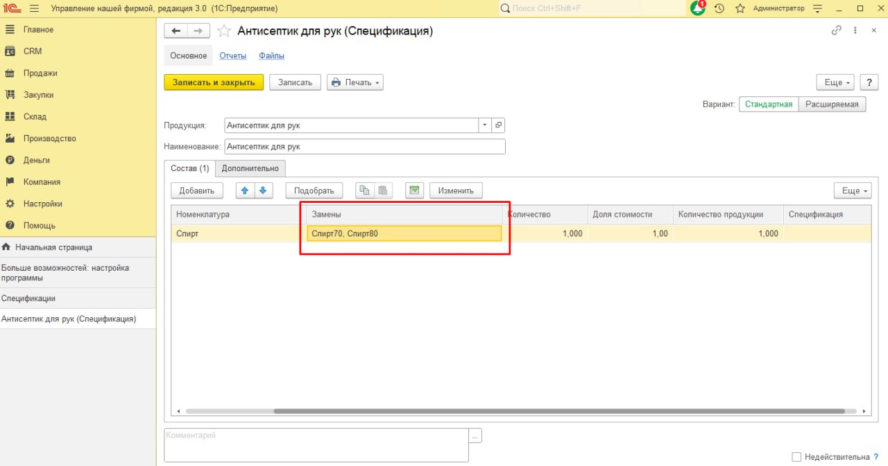 - в спецификации 1С:УНФ добавили поле «Замены» (текст можно вписывать через запятую для допустимых замен).
