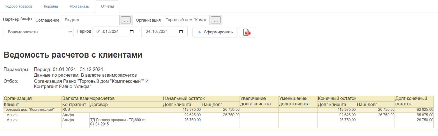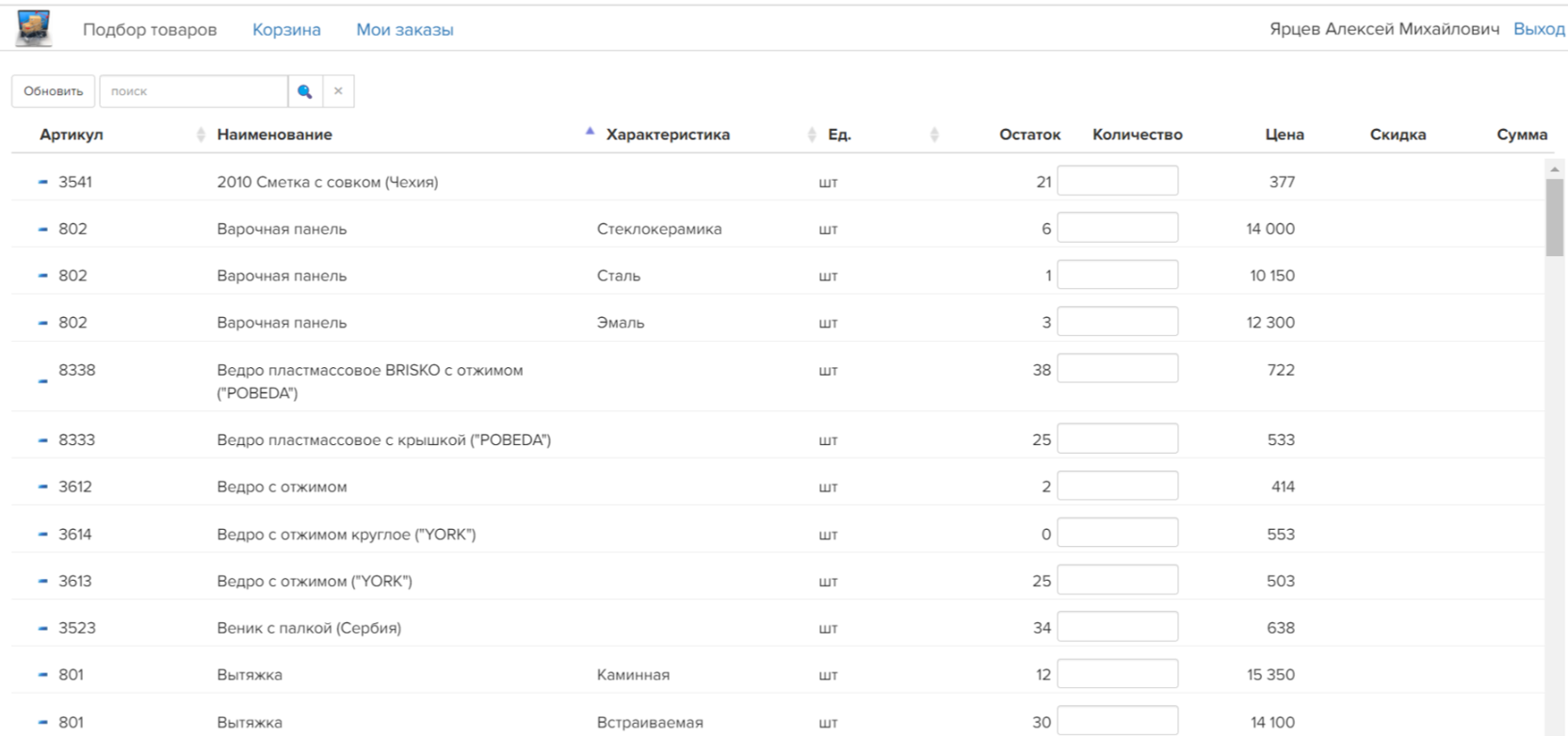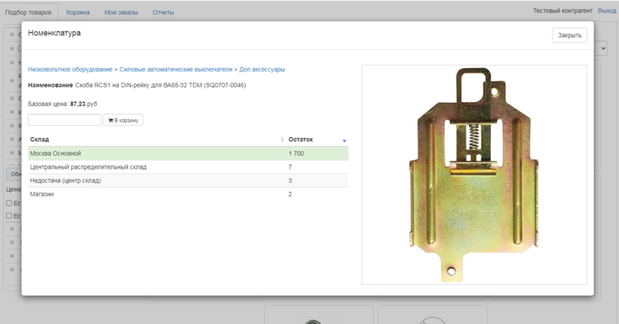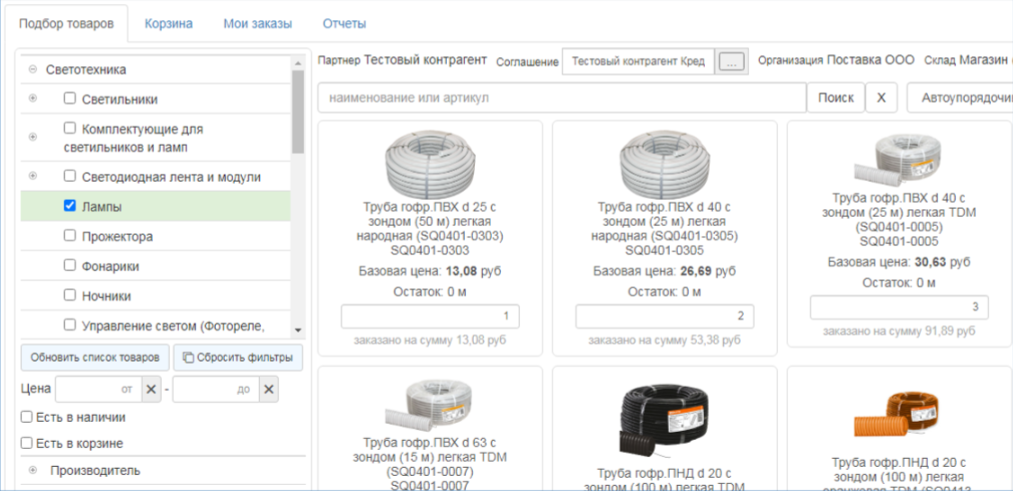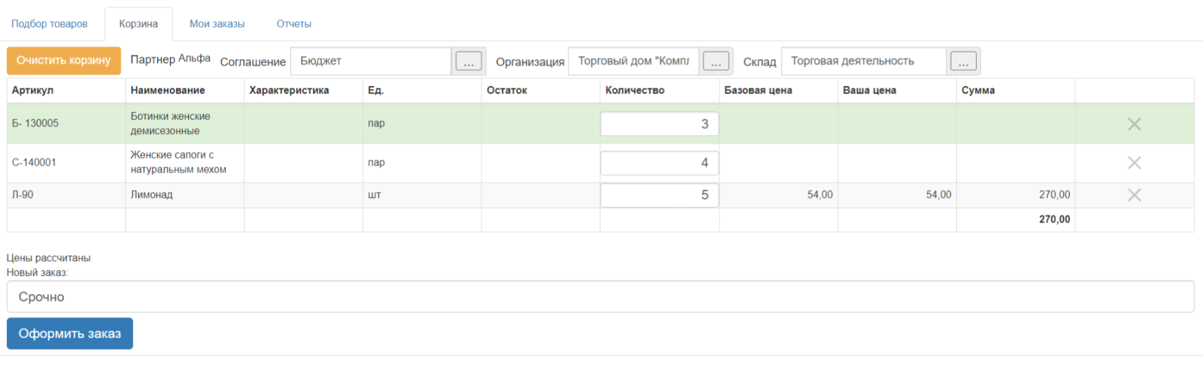 - Клиент подбирает товары в каталоге, видит актуальные остатки, цену и скидки по договору.