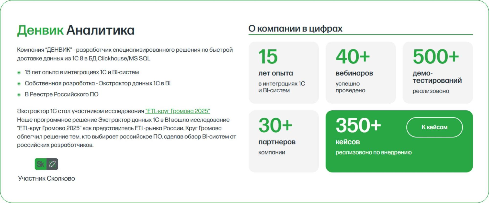 Программные продукты «Денвик Аналитика» включены в реестр российского ПО, компания является резидентом Сколково. Основной фокус компании – развитие экосистемы инструментов для построения управляемого контура данных вокруг 1С: извлечение, трансформация и загрузка данных, а также централизованное управление и мониторинг процессов. Эти решения позволяют ИТ-командам повышать прозрачность автоматизации, оценивать эффект внедрений и гибко адаптировать процессы под изменения бизнес-требований.