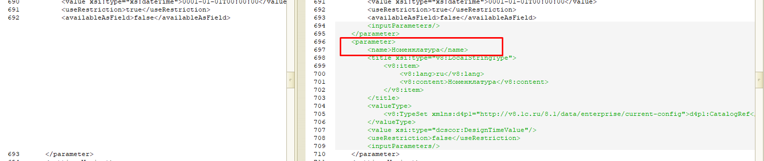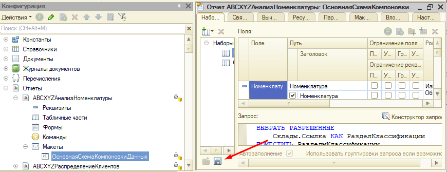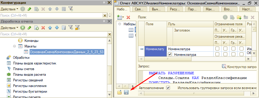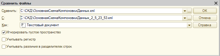 В случае изменения отчета в основной конфигурации мы можем понять, что было изменено в схеме. Для этого мы выгружаем XML из основной конфигурации…