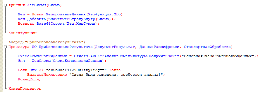 Один из вариантов отследить отчеты, схема которых была изменена – считать MD5 хеш от Схемы и сравнивать его при запуске отчета. Делать мы это будем в событии «ПриКомпоновкеРезультата», так как оно выполняется всегда, в отличие от событий БСП.