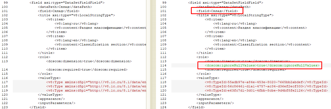 Теперь необходимо адаптировать изменения к нашему отчету. Разница между новой Схемой поставщика и Схемой, которую мы начинали редактировать, изначально нам понятна, можно переносить изменения, в том числе с помощью ручного редактирования XML.
