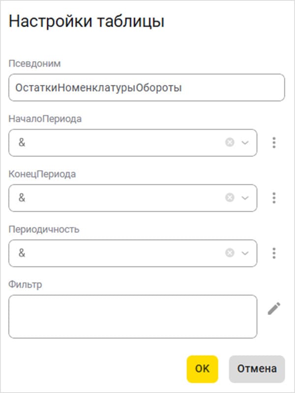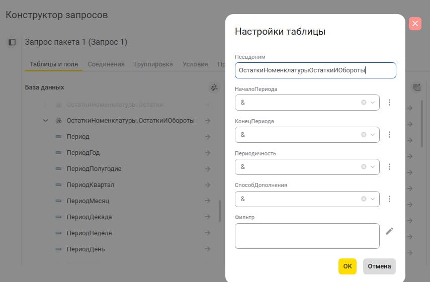 - в языке запросов и конструкторе добавлена поддержка фильтров для виртуальных таблиц остатков, оборотов, остатков и оборотов;