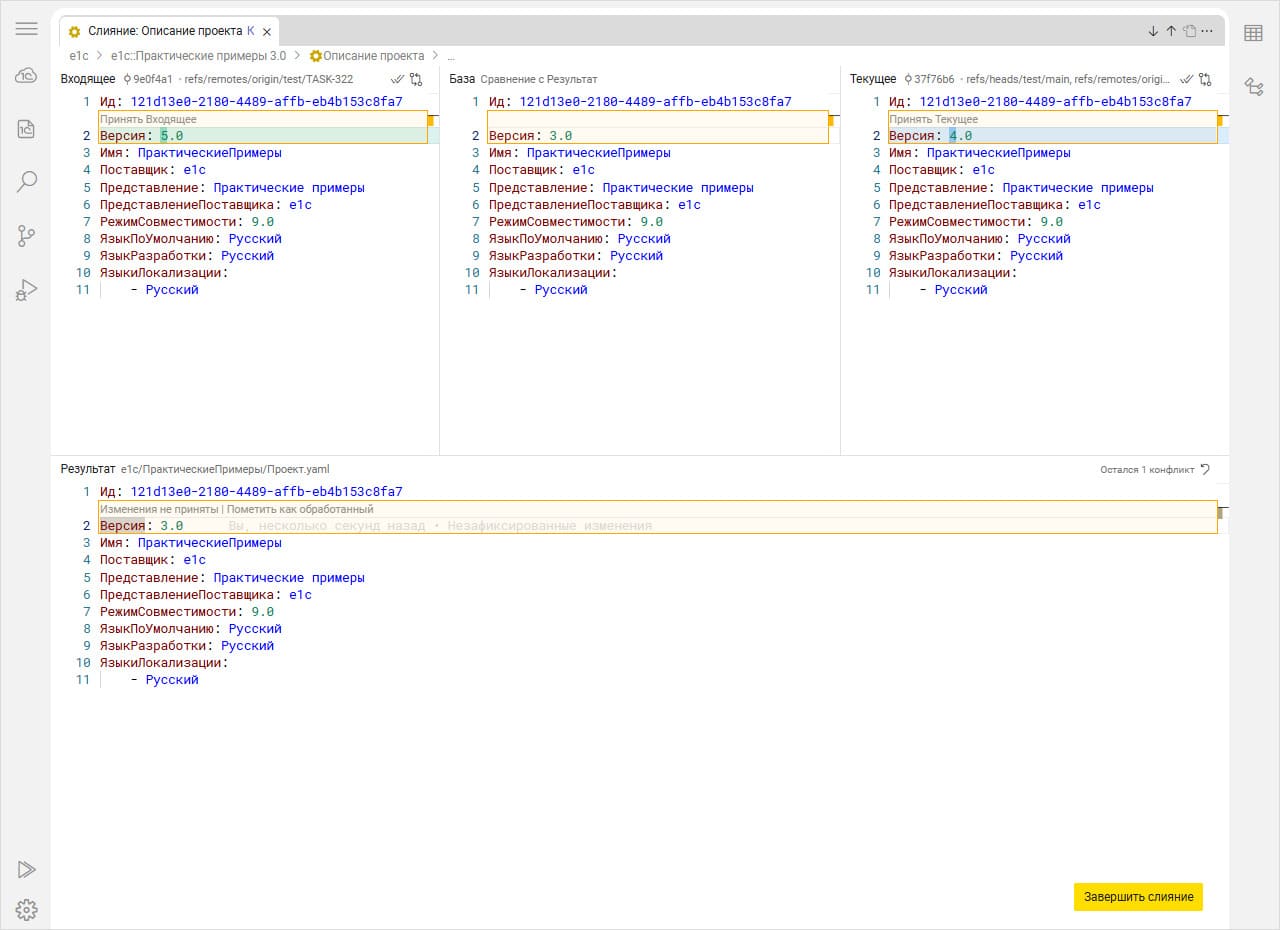 - реализована поддержка трехстороннего слияния для разрешения конфликтов при объединении изменений в коде;