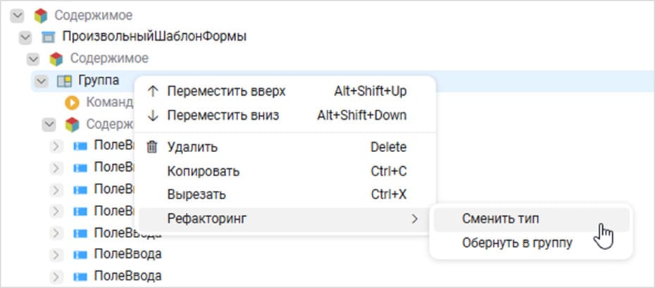 - реализована возможность менять тип выбранного компонента дерева на любой из имеющихся;