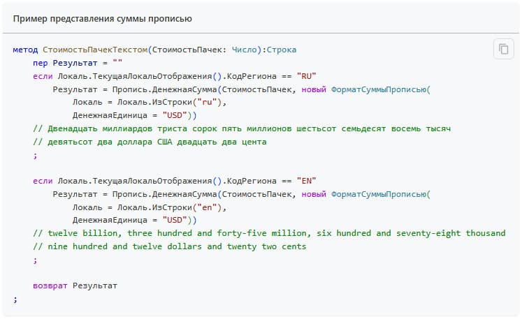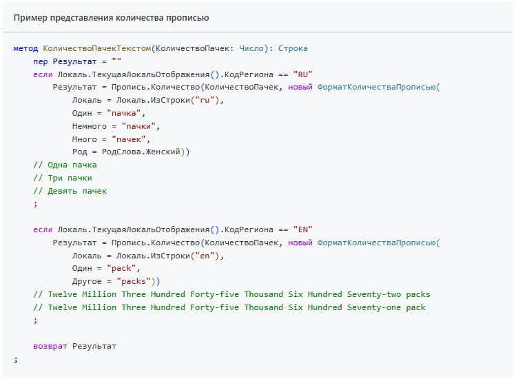 - представление числа, количества и суммы прописью на разных языках;