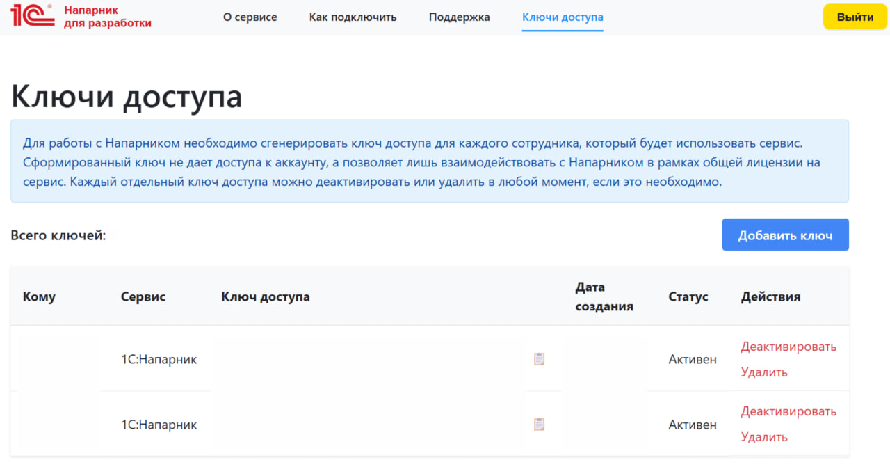 Так выглядит страница с уже полученными для «Напарника» ключами. Источник: code.1c.ai