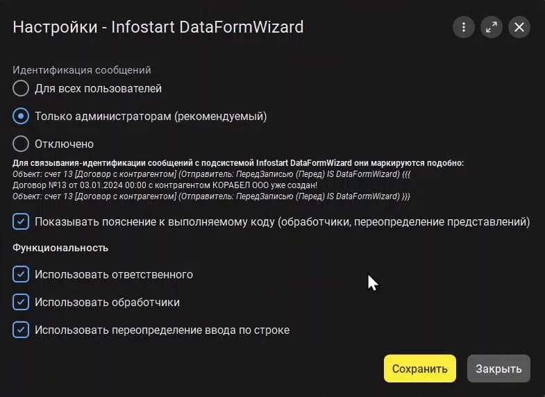 Главное изменение версии 2026.1 Infostart DataFormWizard – адаптация интерфейса под платформу 1С 8.5 с поддержкой темной темы:
