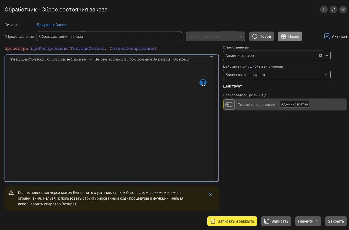 - Дополнять код обработчиков событий без доработки конфигурации – можно заполнить данные значениями по умолчанию, задать условия поведения формы (отключать кнопки, скрывать части интерфейса и т.д.). Поддерживаются обработчики ПриСозданииНаСервере, ПередЗаписью, ПриКопировании, ОбработкаЗаполнения (Ввод на основании), ОбработкаПроверкиЗаполнения.