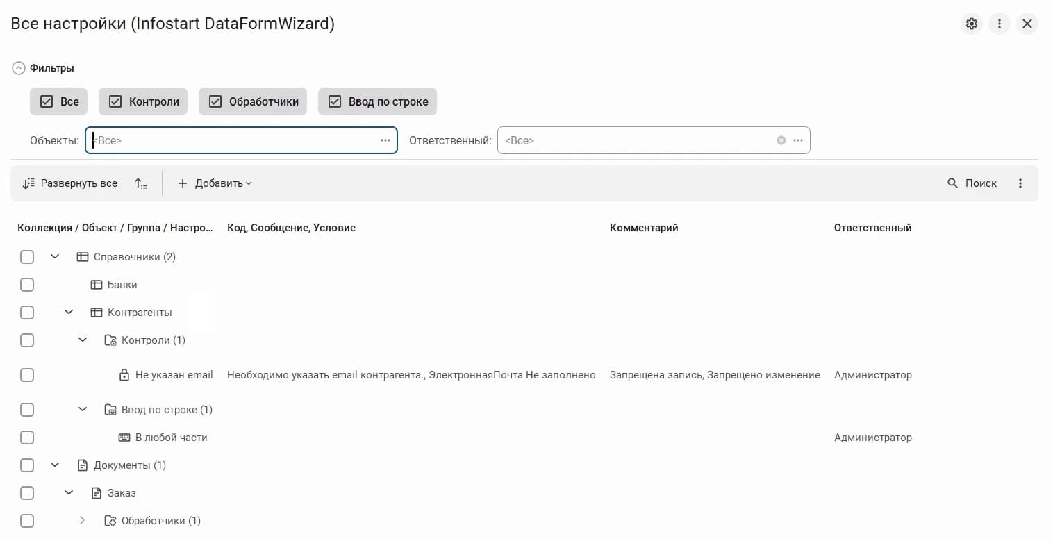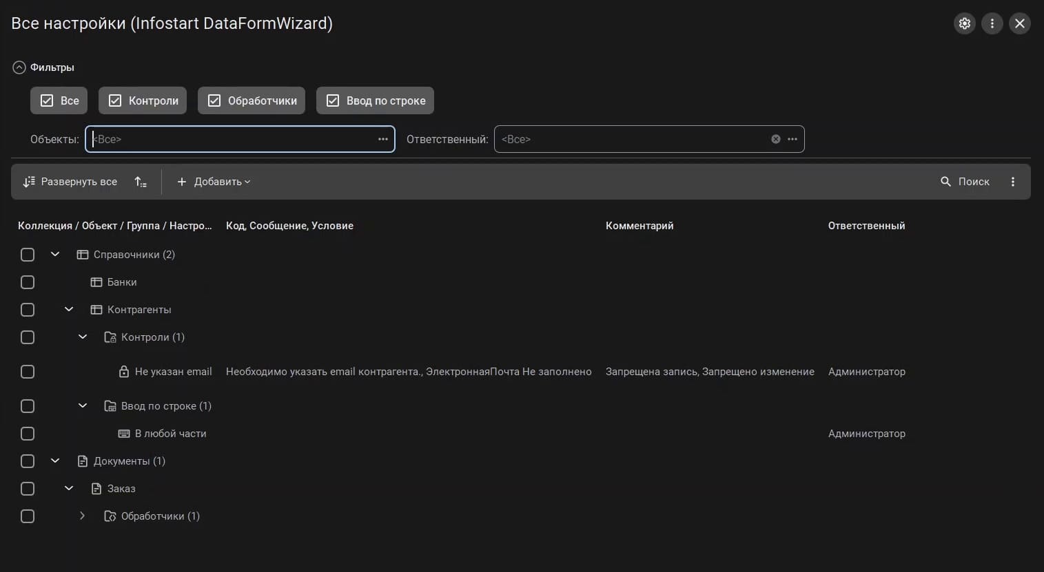 Но теперь в дереве показываются только те группы, в которых есть активные настройки, а пустые разделы автоматически скрываются. Например, если для объекта пока ничего не задано, он отображается без лишних подгрупп – интерфейс остается чистым и не перегруженным.