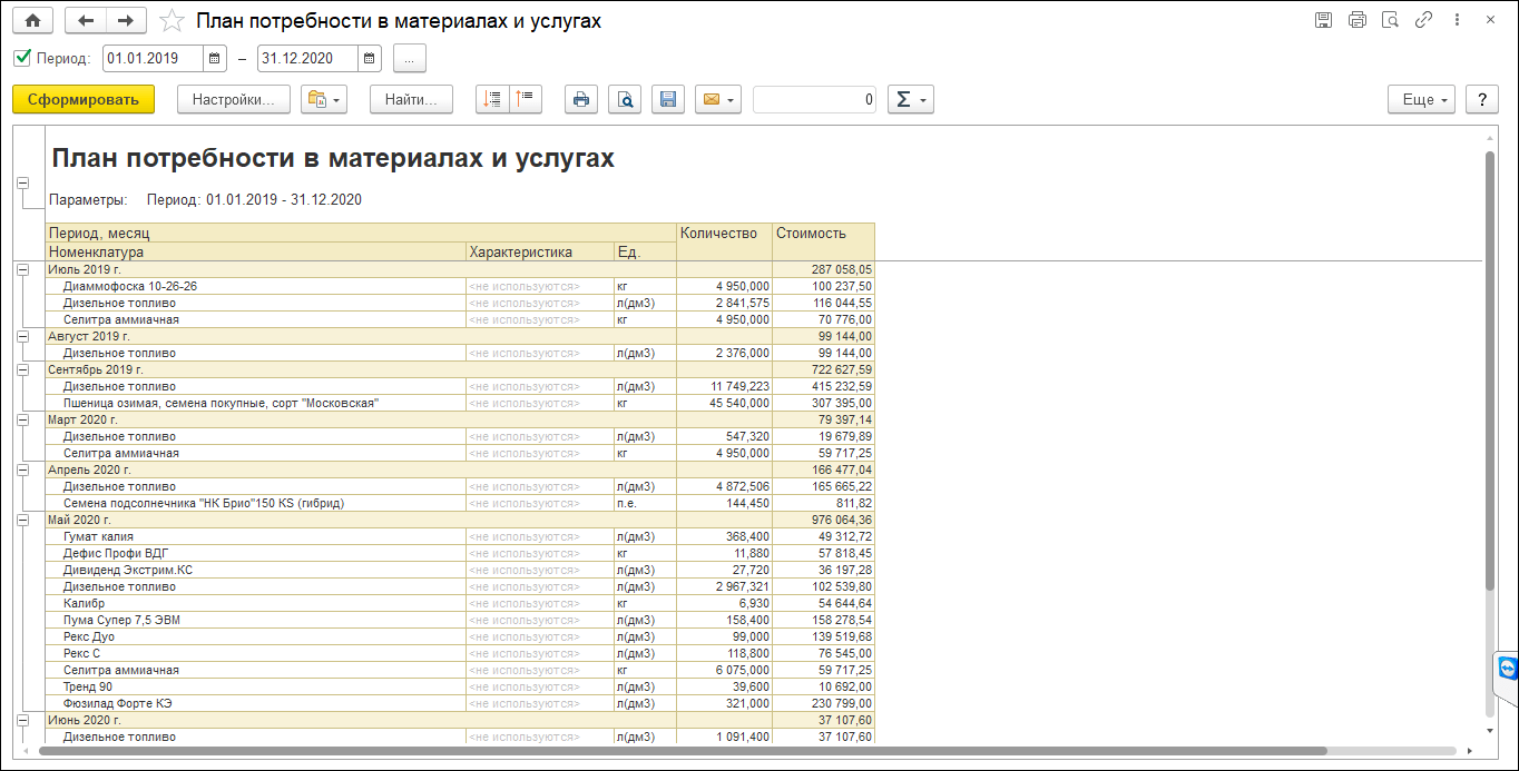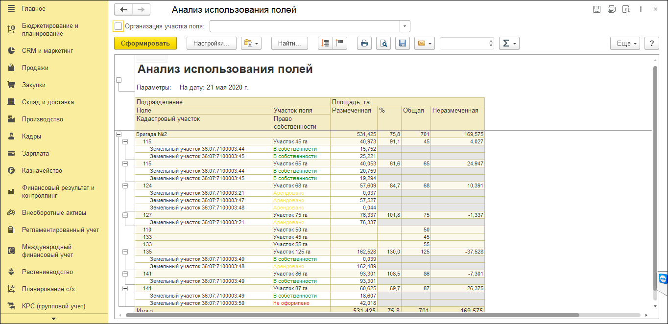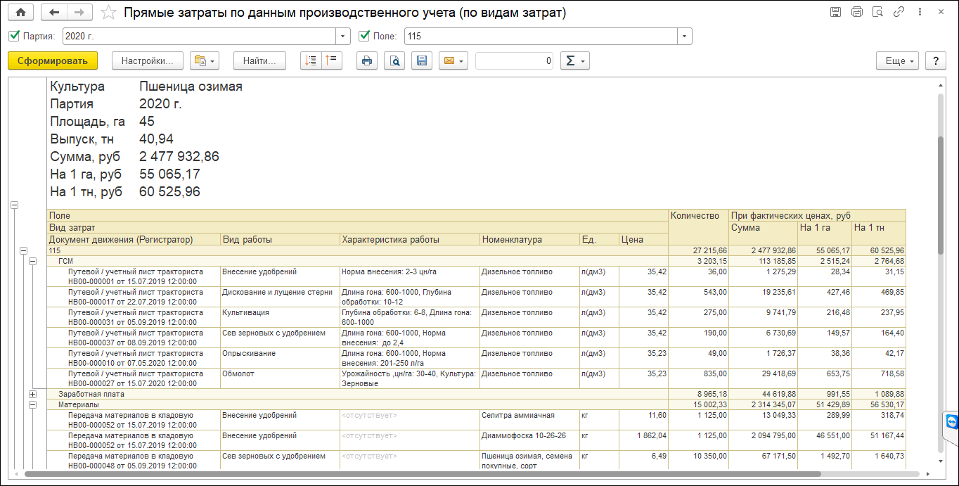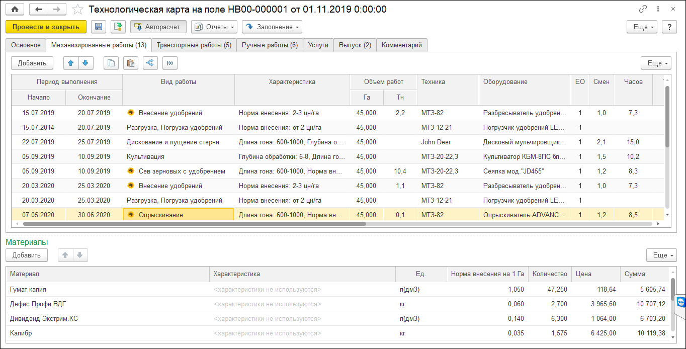 В 1С:ERP АПК для этого используется подсистема планирования сельхоздеятельности. Она помогает формировать технологические карты полей, рассчитывать потребность в материалах и услугах и собирать полноценный бизнес-план сельхозработ.