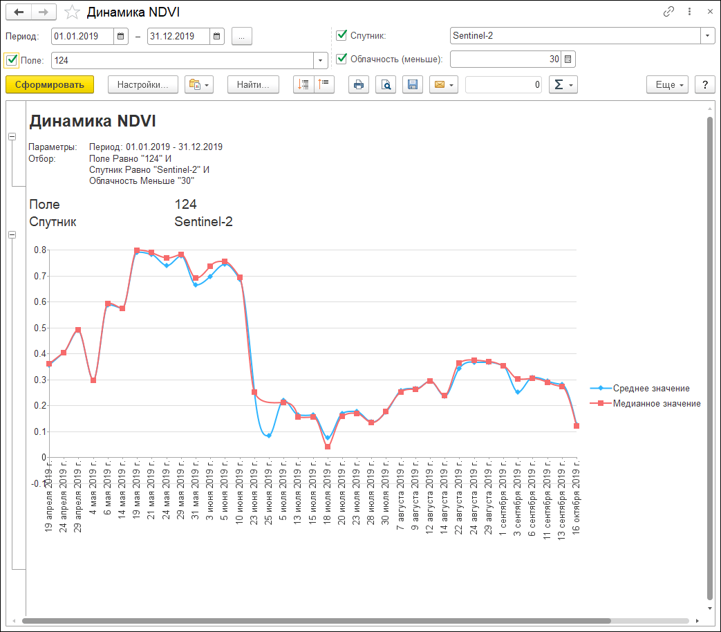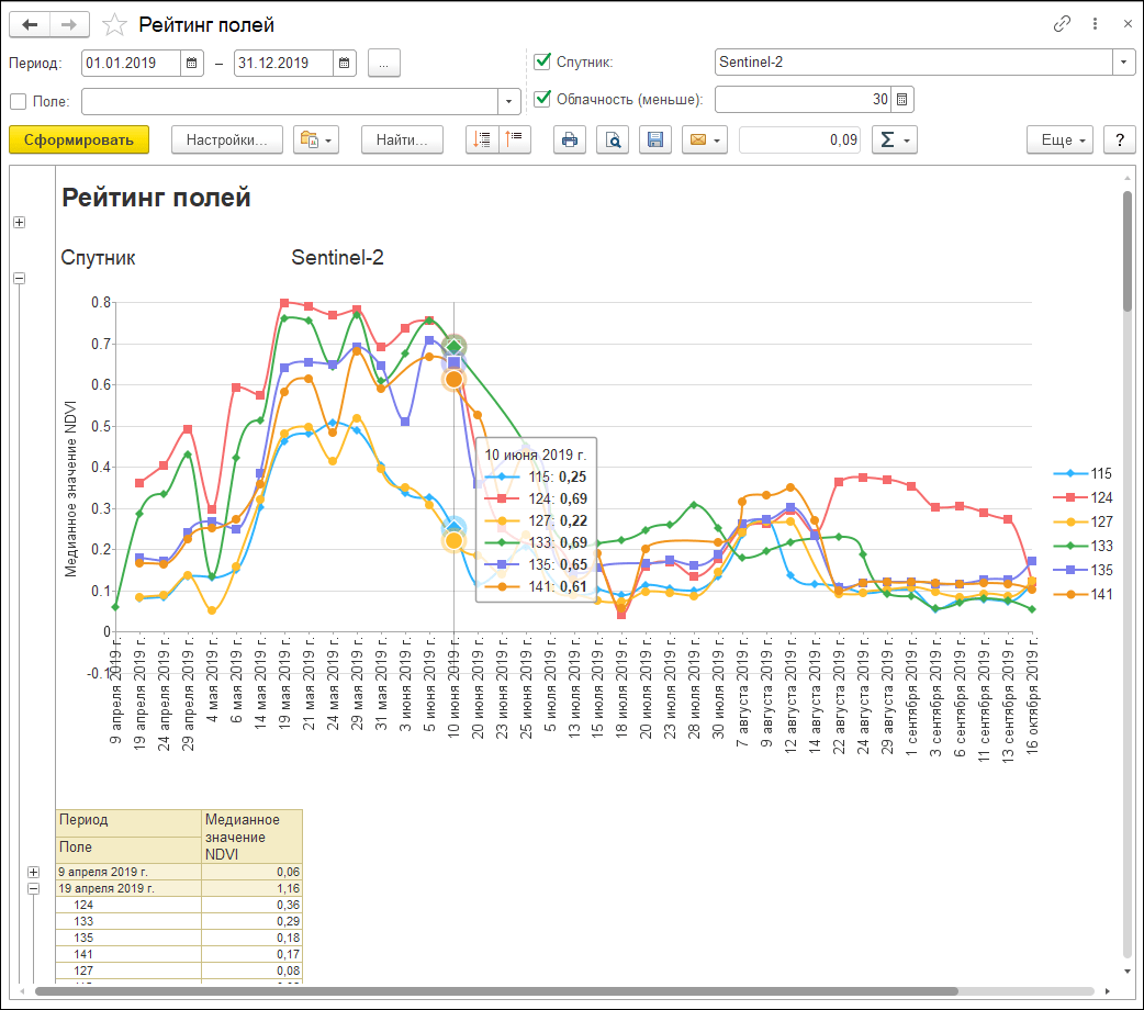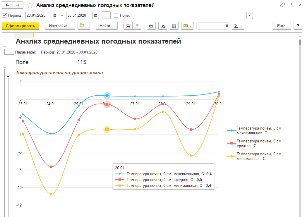 Дополнительно решение позволяет отслеживать погодные показатели в динамике и формировать фактический севооборот за период.