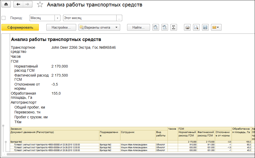 1С:ERP АПК поддерживает интеграцию с GPS-системами, включая Автограф, Омником и Виалон. Благодаря этому в систему автоматически загружаются сведения о фактических механизированных работах: