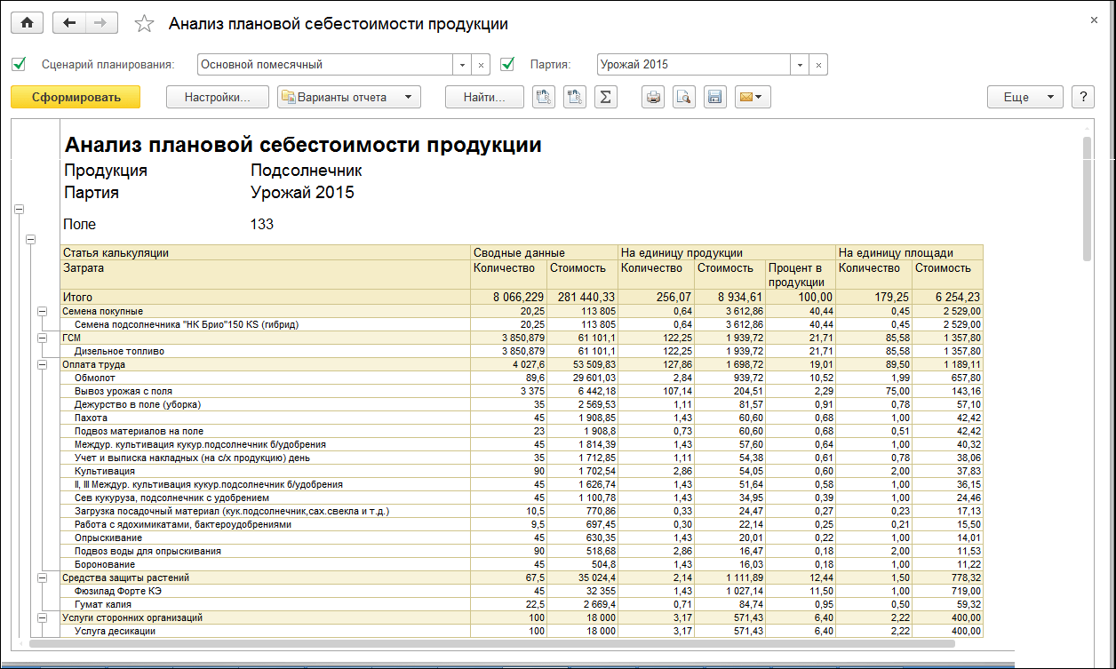 - как будет выглядеть плановая себестоимость по культурам, полям и подразделениям.