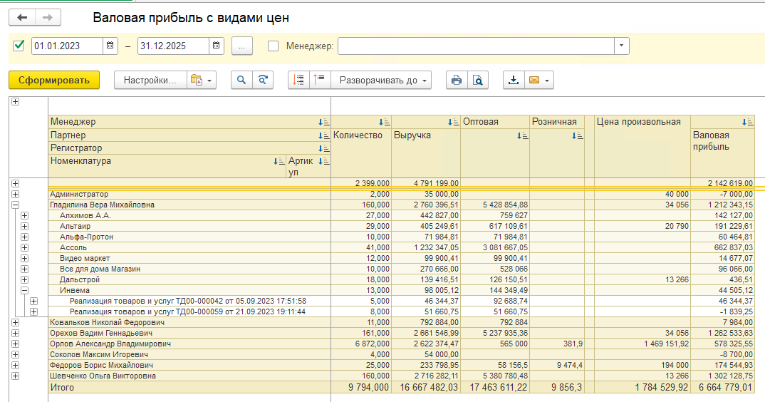 2. Вывели колонки вида цен с итоговыми суммами по каждому виду цен в разрезе менеджеров.