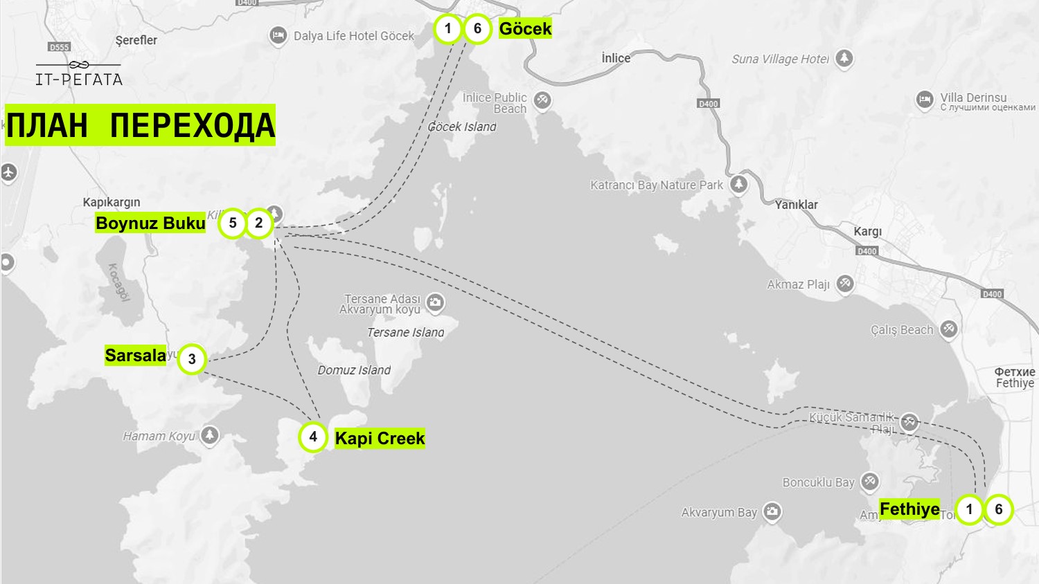 Регата проходит вдоль побережья Турции по маршруту Fethiye – Boynuz Buku – Sarsala – Kapi Creek и обратно. Это полноценное путешествие с ежедневными переходами: каждый день новая точка, новые условия и новые задачи.