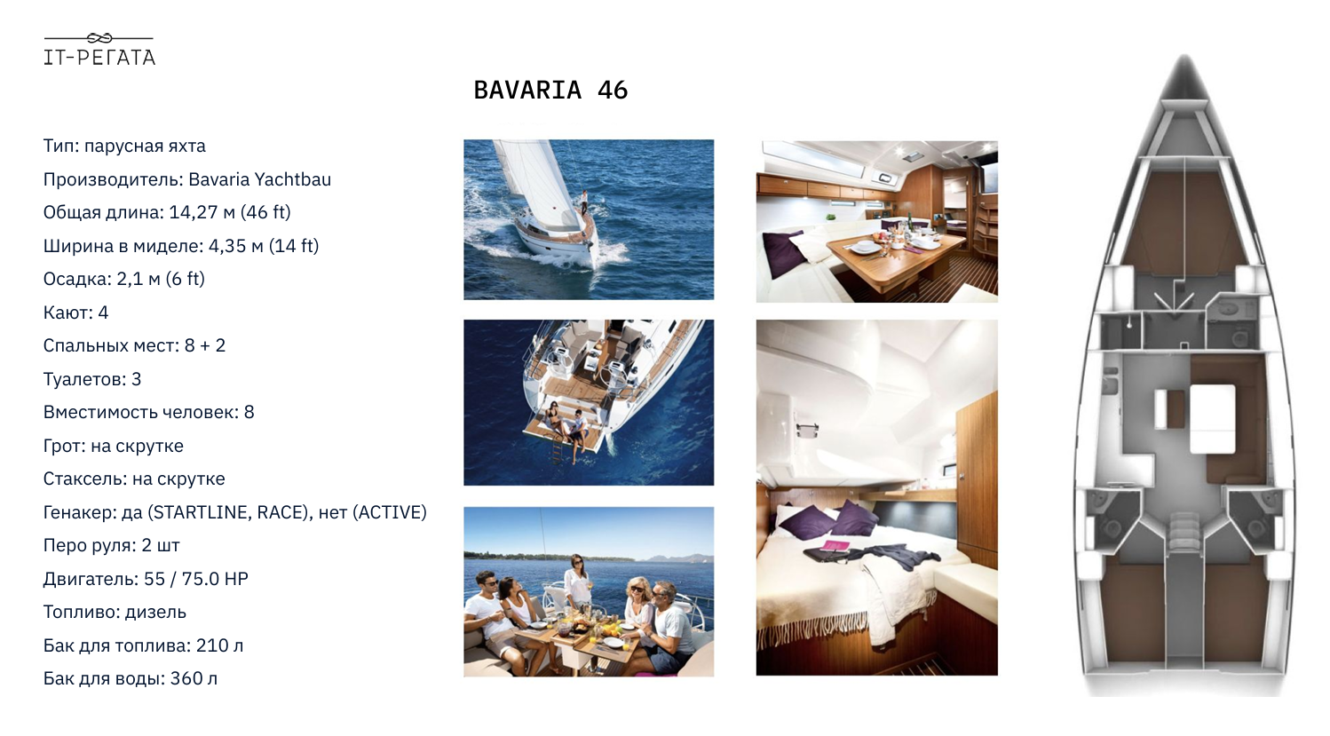 Флот регаты – это яхты Bavaria Cruiser 46. Они дают баланс между комфортом и настоящим парусным опытом. Внутри – полноценное пространство для жизни: каюты, кухня, общая зона.