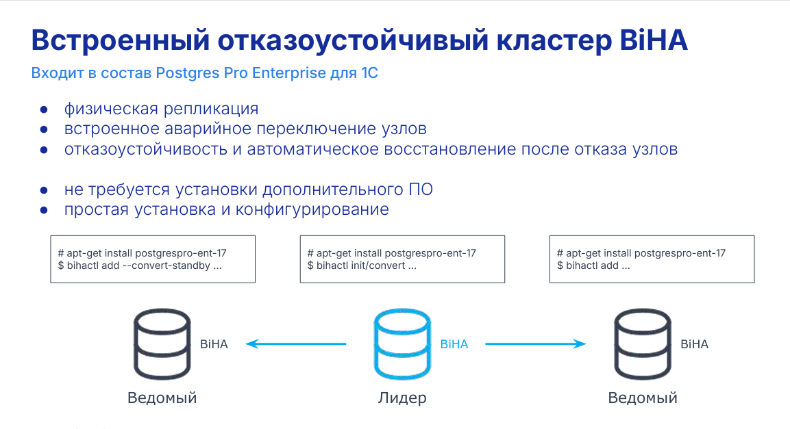 В случае Postgres Pro Enterprise подход другой. Отказоустойчивость встроена в саму систему. Кластер BiHA является частью логики работы СУБД.