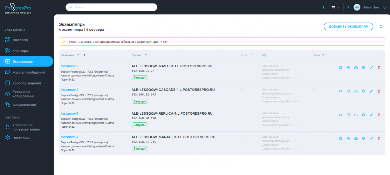 В Postgres Pro Enterprise этот слой закрывается единым инструментом управления Postgres Pro Enterprise Manager (PPEM), который экономит время команды и снижает количество ошибок.