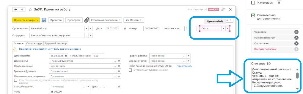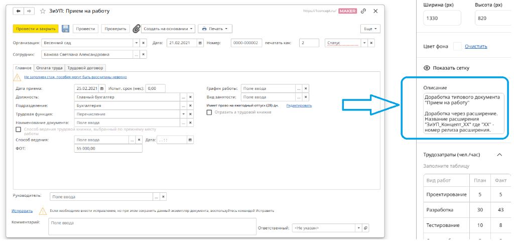 - Автоматически создается документ с названием «[Имя формы]. Описание», в который переносится: