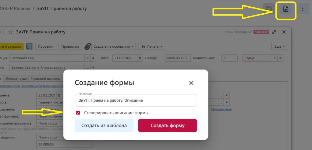 - Нажимаете на кнопку «Создать описания», в открывшемся окне ставите галочку «Сгенерировать описание формы».