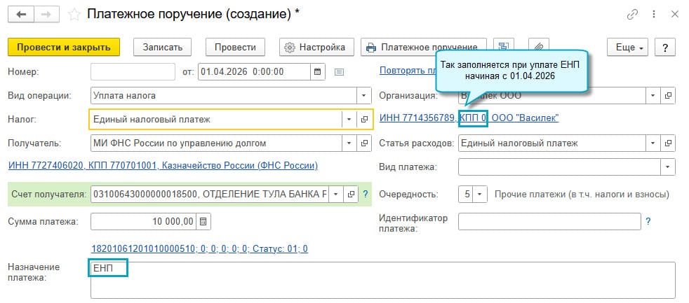 В частности, при уплате налогов, сборов и страховых взносов единым налоговым платежом (ЕНП) на ЕНС с 1 апреля 2026 года нужно будет указывать:
