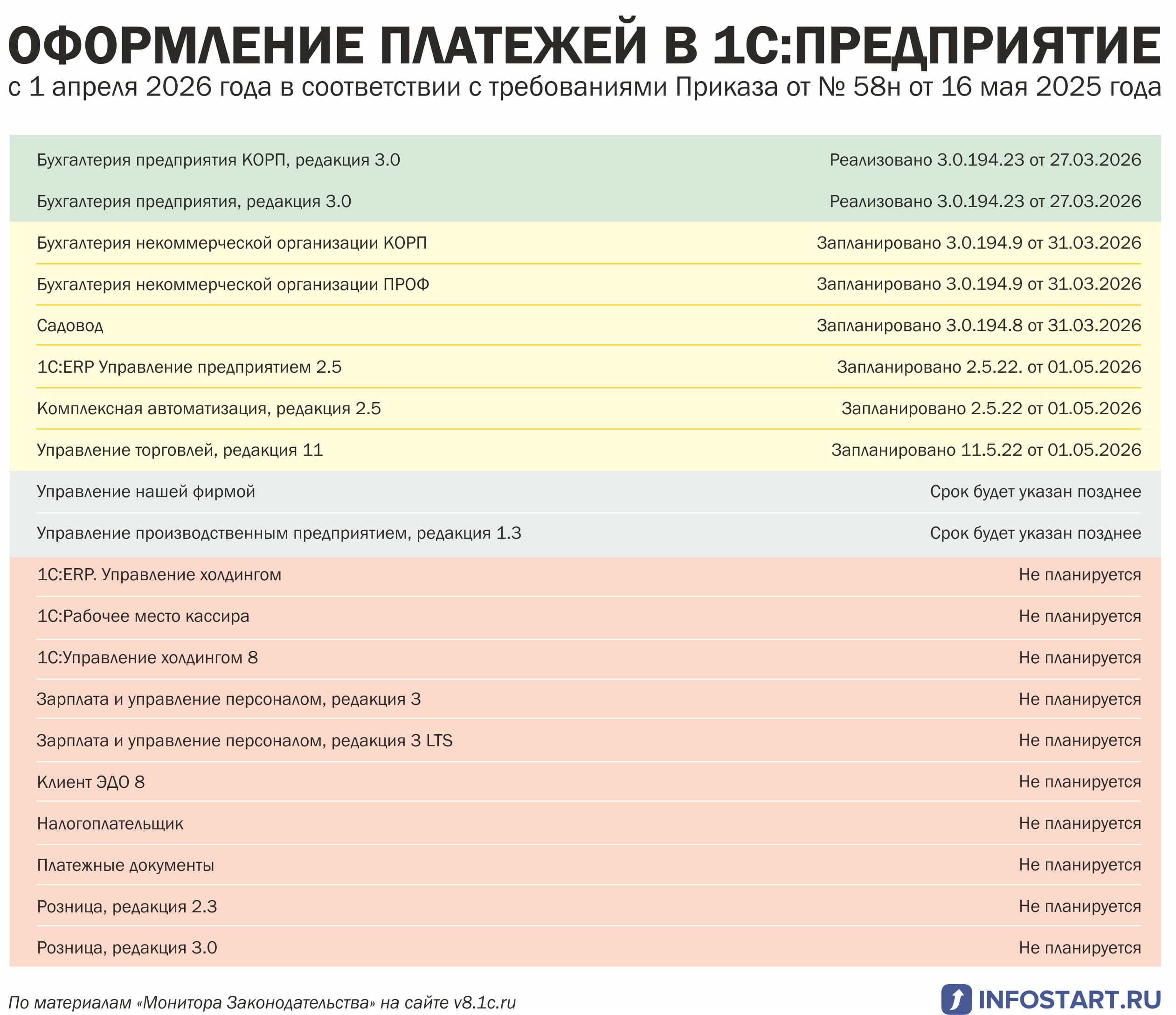 О сроках реализации новых правил оформления платежных поручений в конфигурациях 1С можно узнать в «Мониторе законодательства 1С».
