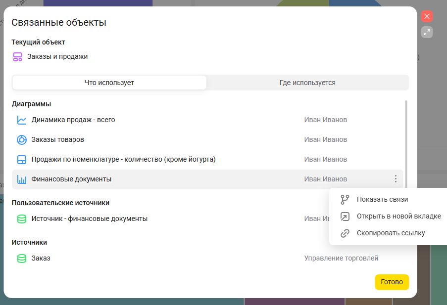 Для диаграмм, дашбордов и источников данных добавлен инструмент просмотра связей, чтобы заранее понимать, на что повлияет редактирование источников.