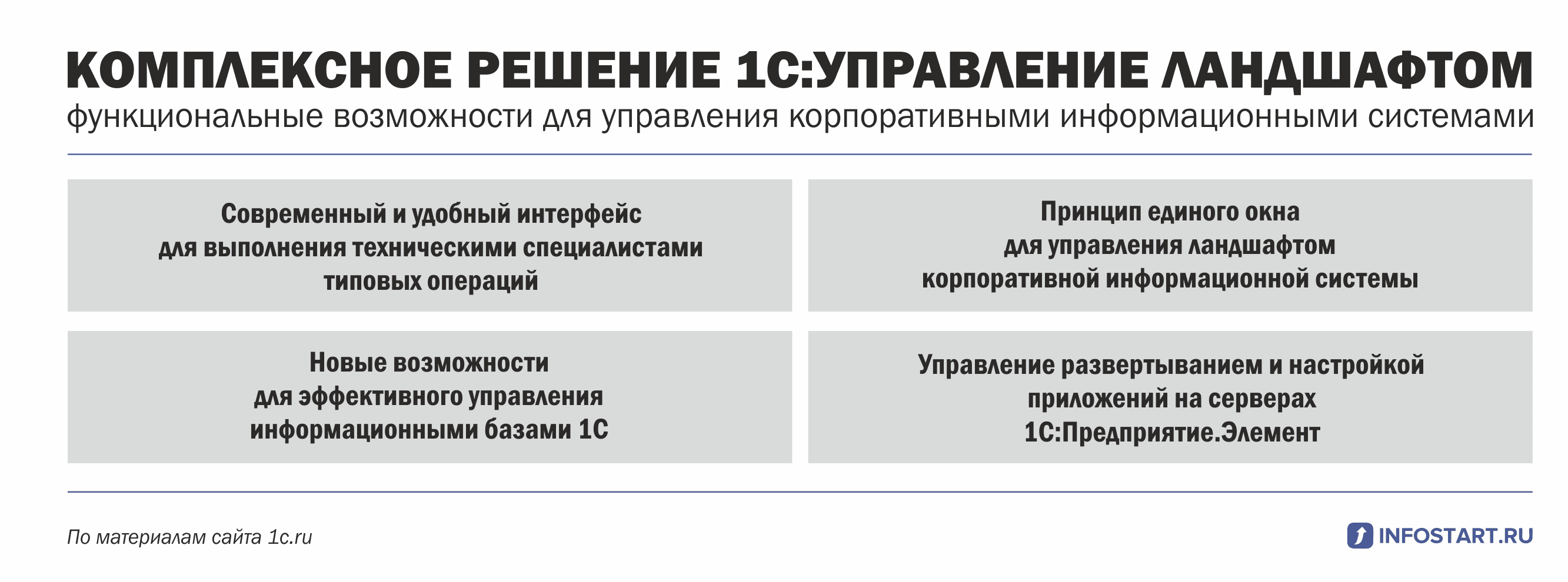 Фирма «1С» позиционирует 1С:Управление ландшафтом как комплексное решение для централизованного администрирования баз 1С, снижающее риски при обслуживании корпоративных информационных систем.