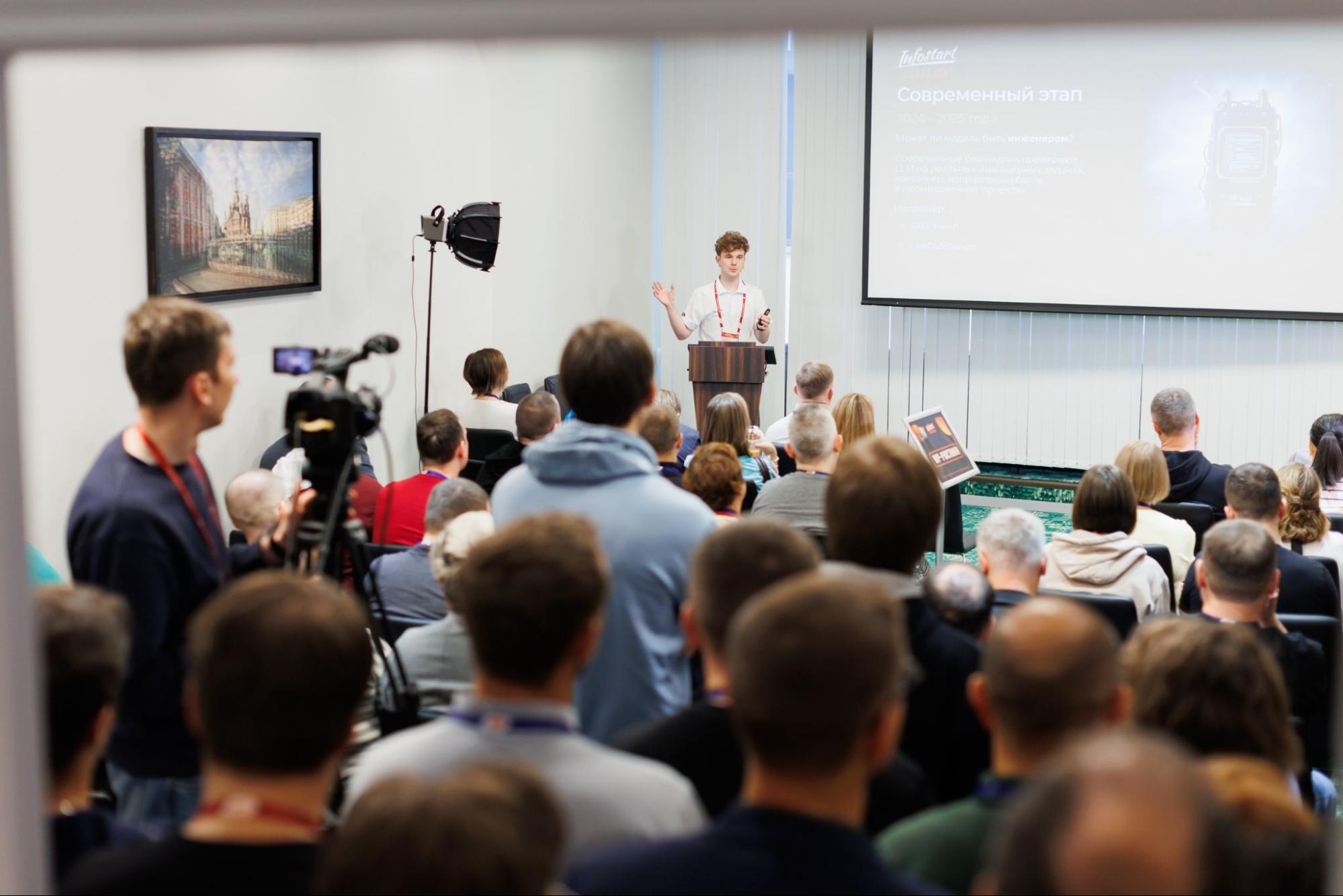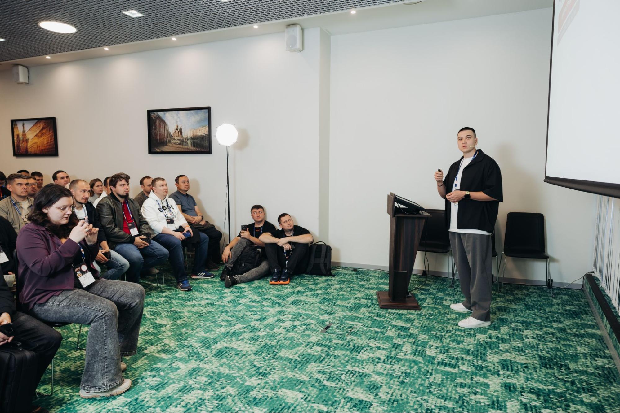 В программе – 12 серьезных технических докладов. Спикерам активно задавали вопросы, а количество желающих послушать доклад иногда превышало возможности площадки: для тех, кому не хватало сидячих мест, организовали просмотр в режиме онлайн на экране рядом с залом «Стрельна».