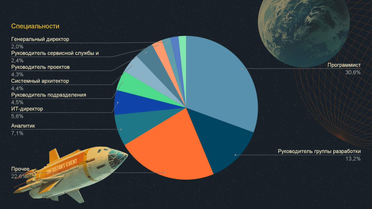 В этом году в конференции участвовали 1527 гостей. Большинство участников – разработчики 1С и руководители группы разработки: 30,6% и 13,2% соответственно.
