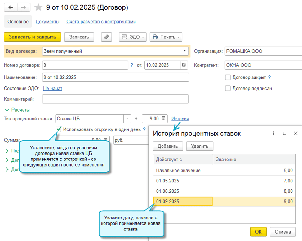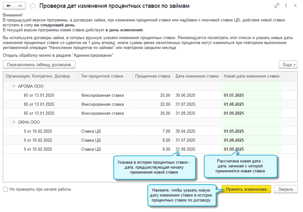 в договорах по займам полученным изменены правила указания процентных ставок «Ставка ЦБ + X%» и «Фиксированная ставка» – ранее они учитывались с отсрочкой в один день, теперь указывается точная дата, начиная с которой применяется новая ставка; с помощью обработки «Проверка дат изменения процентных ставок по займам» можно проверить и при необходимости обновить даты в истории процентных ставок; для уже созданных договоров, зависящих от ставок ЦБ, снимать флаг «Использовать отсрочку в один день» не рекомендуется;