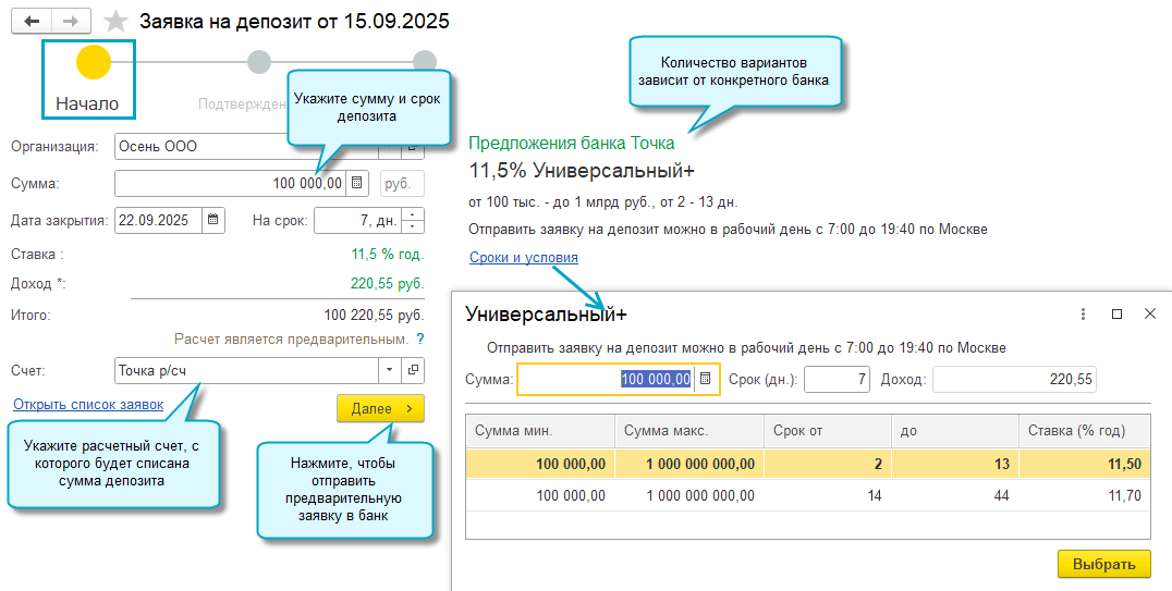 Заявка из 1С:Бухгалтерии сразу уходит в банк с использованием сервиса 1С:Депозит. Источник: its.1c.ru