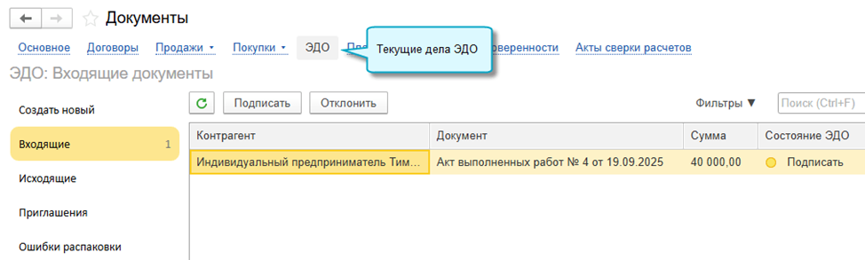 обработка «Текущие дела ЭДО в простом интерфейсе выделена в отдельный раздел, чтобы быстрее переходить к работе с документами в электронном документообороте;