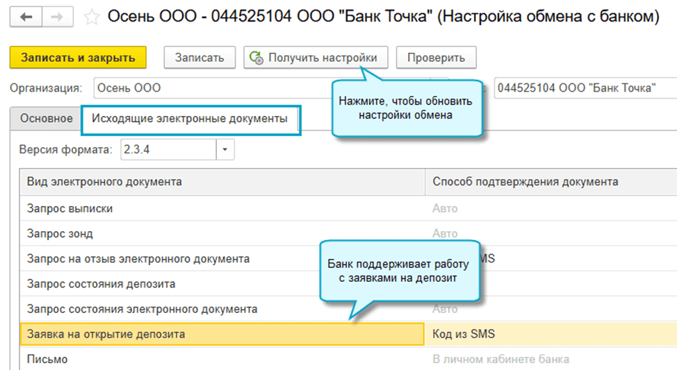 Новый сервис 1С:Депозит, с помощью которого можно сразу из программы отправлять в банки-партнеры заявки на открытие депозитов. По согласованной заявке банк открывает депозит и присылает подтверждение. Расчетный счет, с которого списывается депозит, должен быть открыт в том же банке. При отправке заявки потребуется пройти аутентификацию на сервере банка и дополнительно подтвердить платеж кодом из SMS. Возможность использования сервиса 1С:Депозит доступна для расчетных счетов в банках, которые поддерживают работу с сервисом и подключены к 1С:ДиректБанк. Проверить возможность работы с сервисом можно, обновив настройки обмена с банком – если в списке исходящих электронных документов есть «Заявка на открытие депозита», сервис 1С:Депозит банком поддерживается.