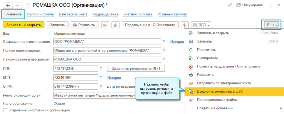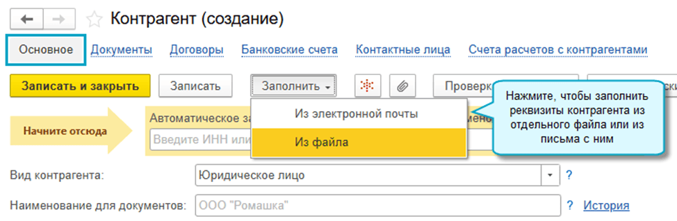 добавлена возможность выгрузить реквизиты своей организации в файл без отправки по электронной почте, а также заполнить реквизиты контрагентов из файлов других конфигураций.