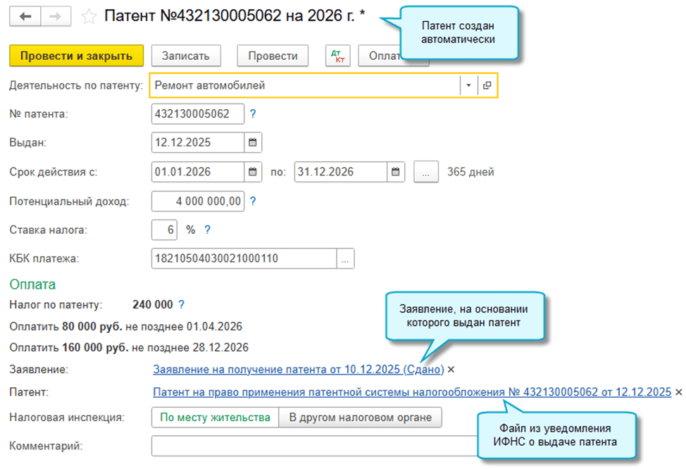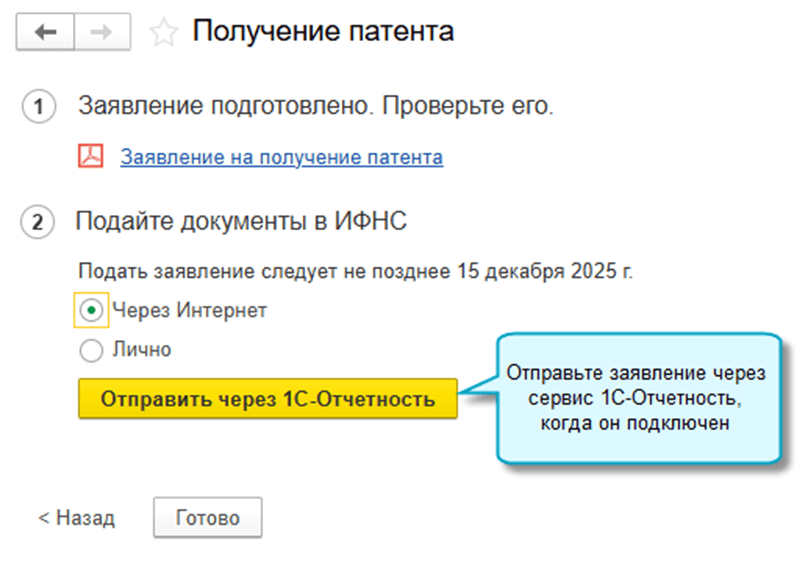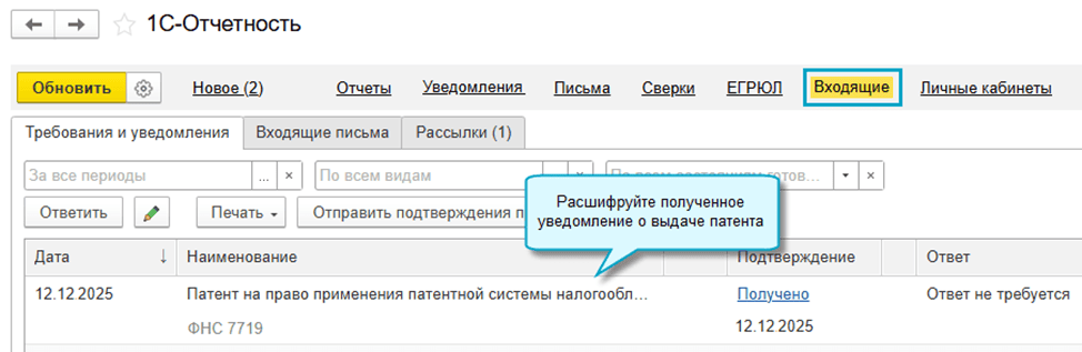 Уведомление о выдаче патента поступит через сервис 1С-Отчетность