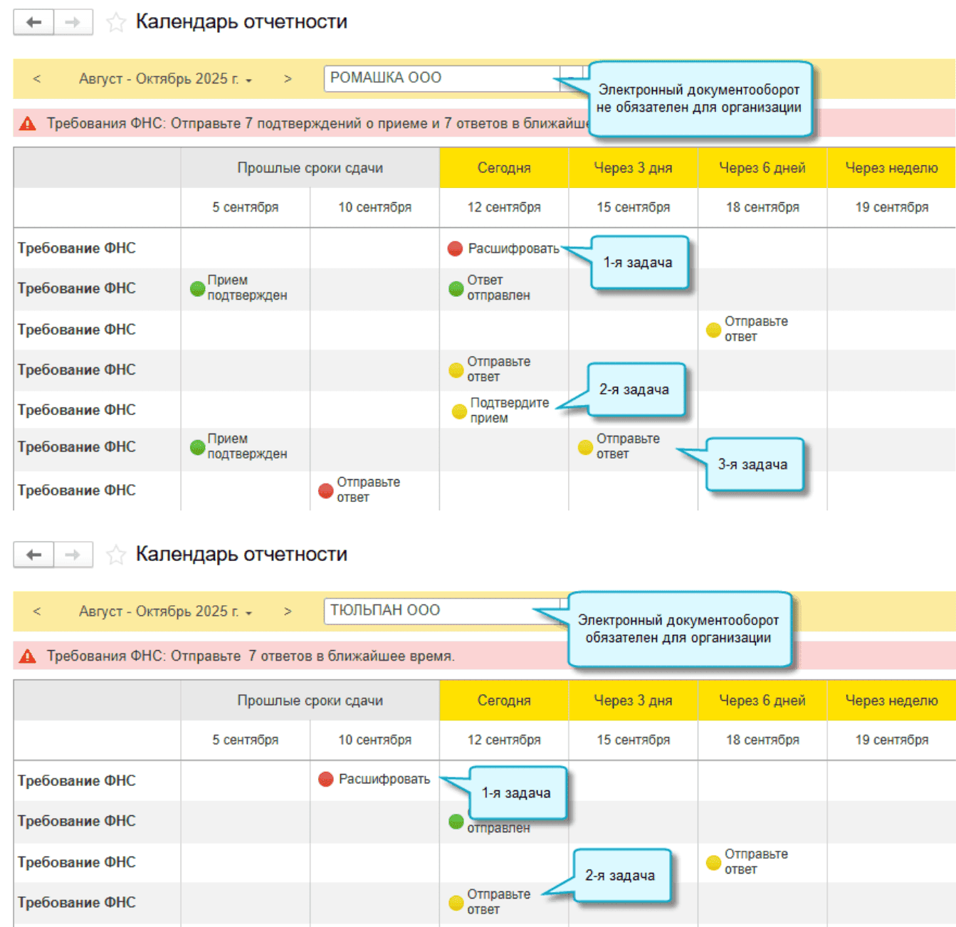 Состав задач по требованиям ФНС в календаре отчетности. Теперь в календаре различаются состав и сроки задач по требованиям ФНС в зависимости от того, обязателен ли для организации электронный документооборот с ФНС или нет.