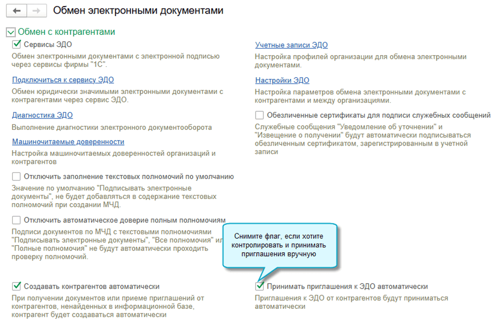 приглашения от контрагентов к обмену через ЭДО теперь принимаются автоматически – чтобы контролировать этот процесс самостоятельно, требуется снять галочку в настройках;