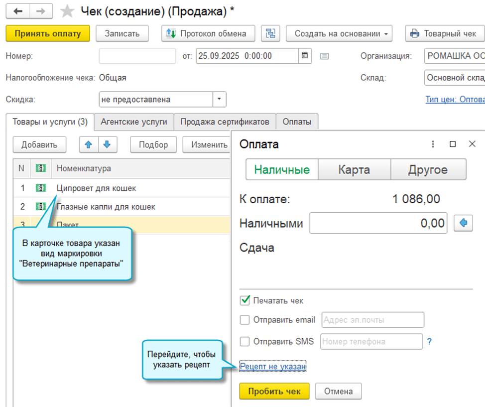при продаже маркируемого ветеринарного препарата в чеке можно передавать данные о рецепте; если у покупателя несколько рецептов, чеки следует пробивать отдельно по каждому.