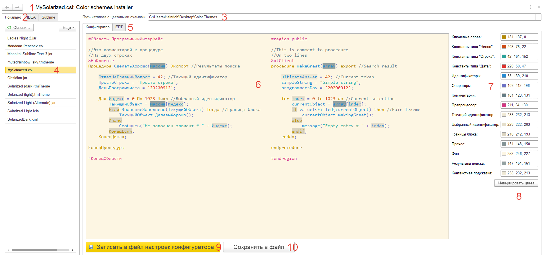 Загрузка, редактирование и установка цветовых схем (раскраски кода) в Конфигуратор и EDT