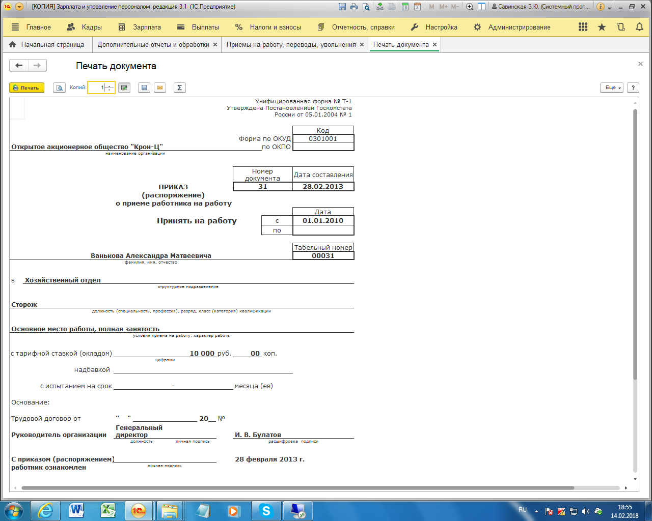 Печать приказа о приеме (Т-1), кадровом переводе (Т-5), отпуске (Т-6), командировке (Т-9) и увольнении (Т-8) в том числе списком (ЗУП 3.1)