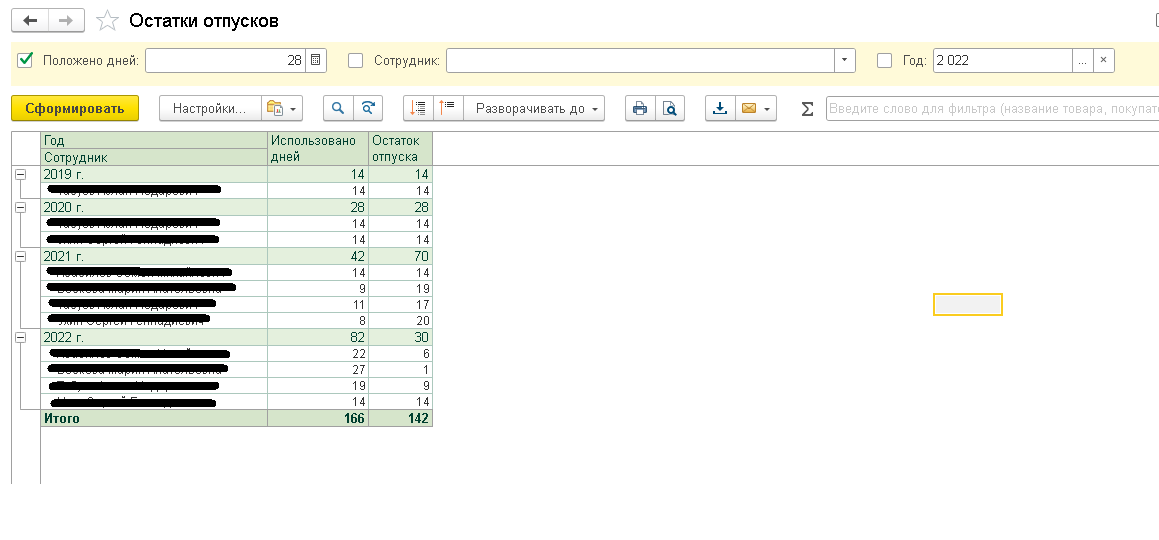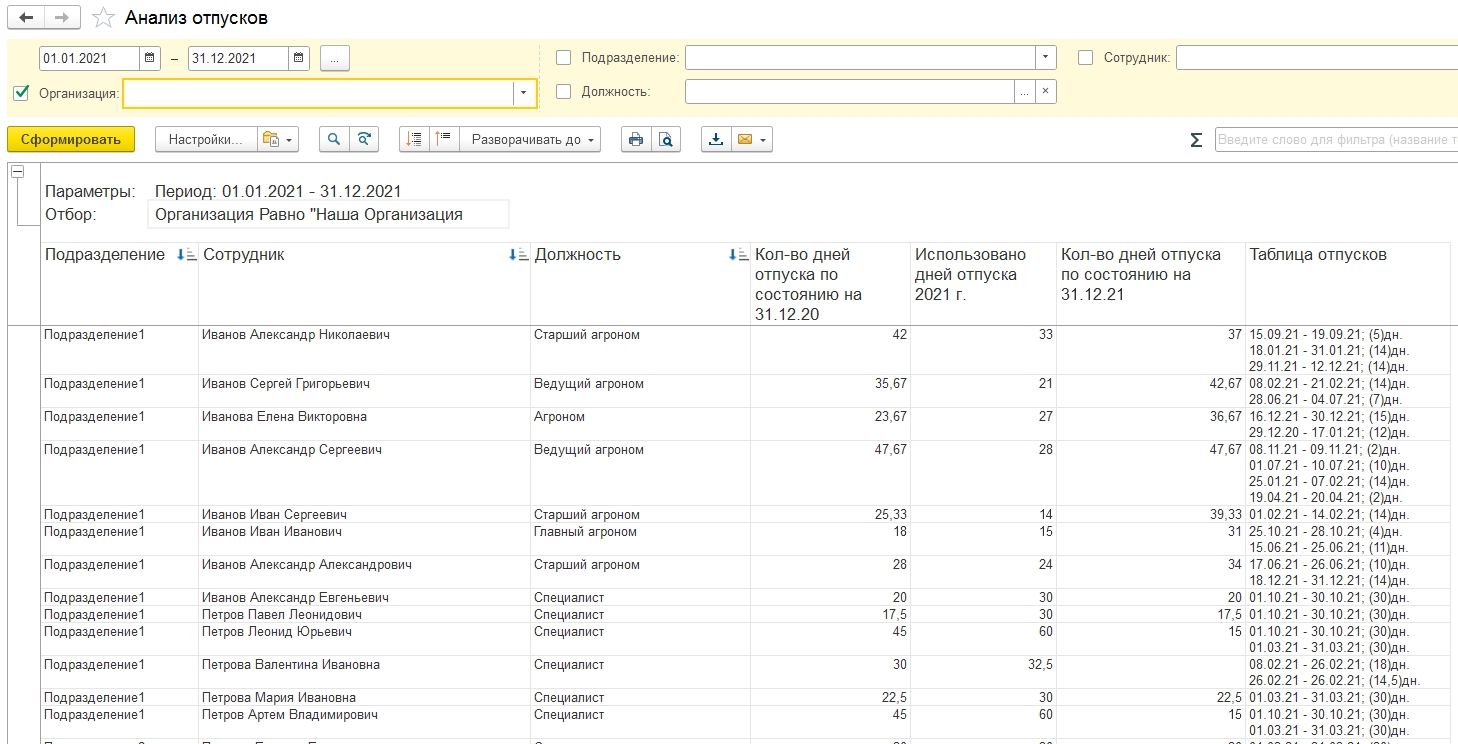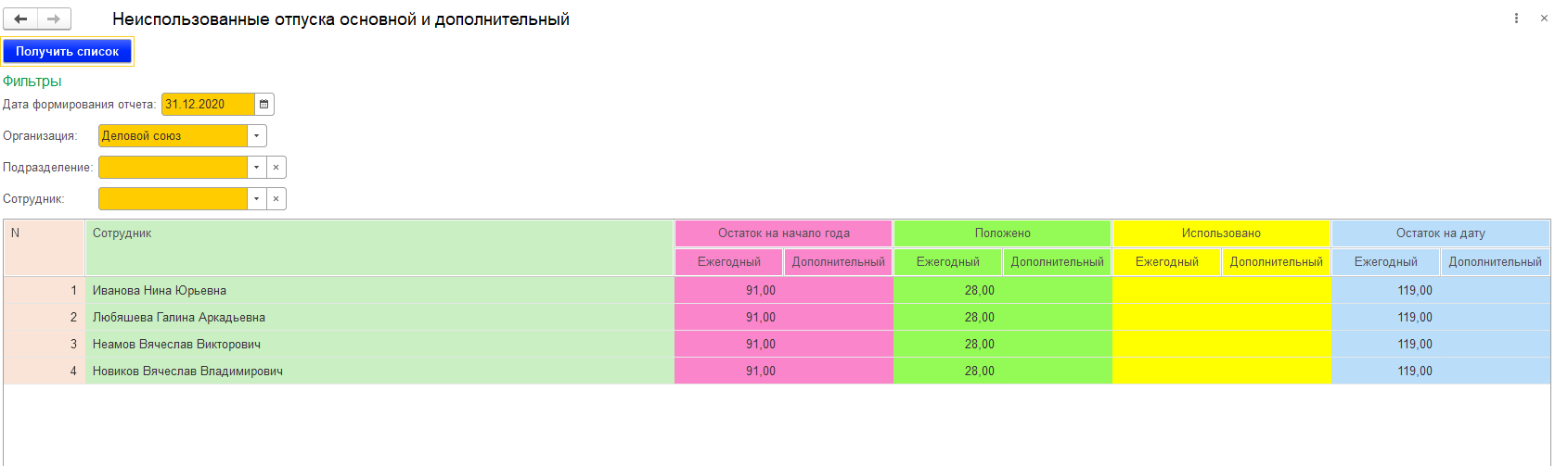 Отчет показывает неиспользованные отпуска, отпуска на начало года, отпуска, которые положены сотруднику (должны быть начислены), использованные отпуска и остаток отпусков на дату.