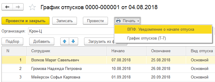 Что сделали: установили из 1С-Store печатную форму «Уведомления о начале отпуска» и обработку «Заполнение документа Отпуск сотрудников по Графику отпусков».
