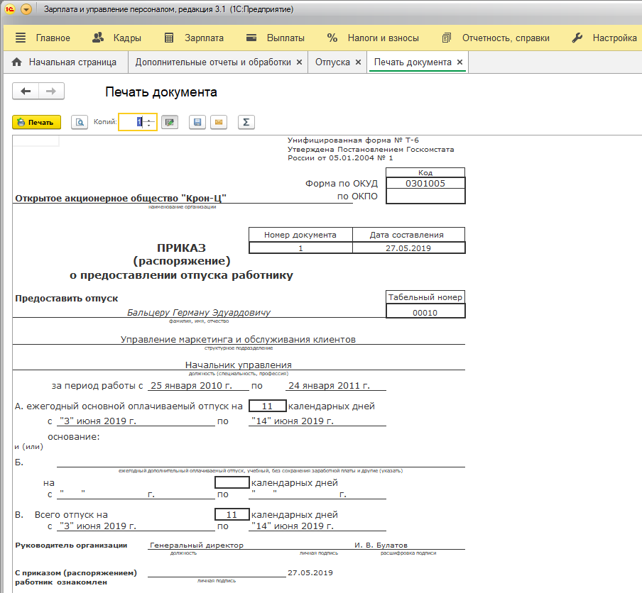 Печать приказа о предоставлении отпуска (Т-6) и приказа о предоставлении отпуска работникам (Т-6а)