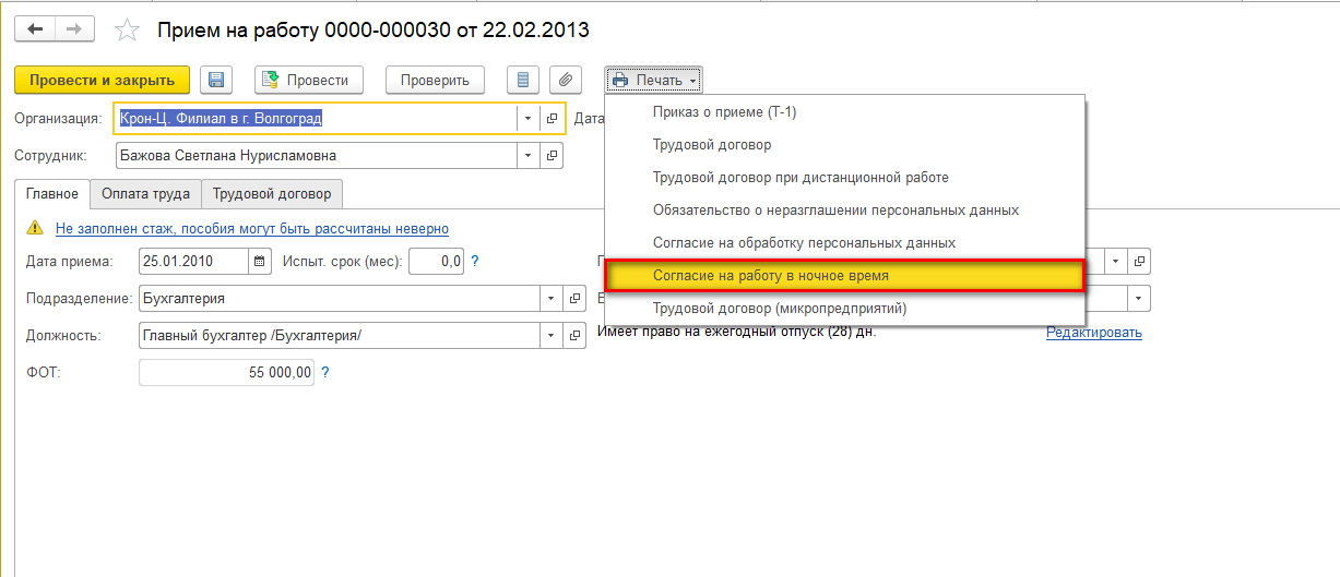 Печатная форма «Согласие на работу в ночное время» для 1С: ЗУП 3.1
