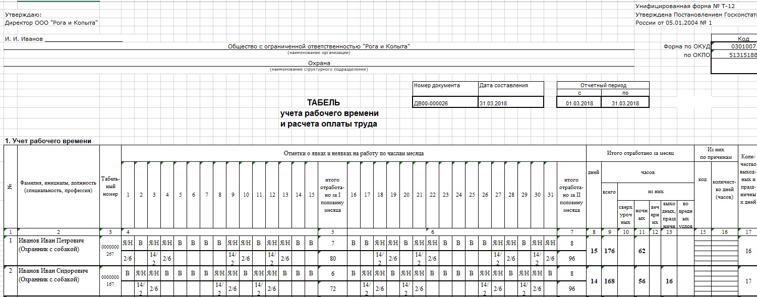 Табель учета рабочего времени Т-12 с подсчетом итогов для ЗУП 3.1