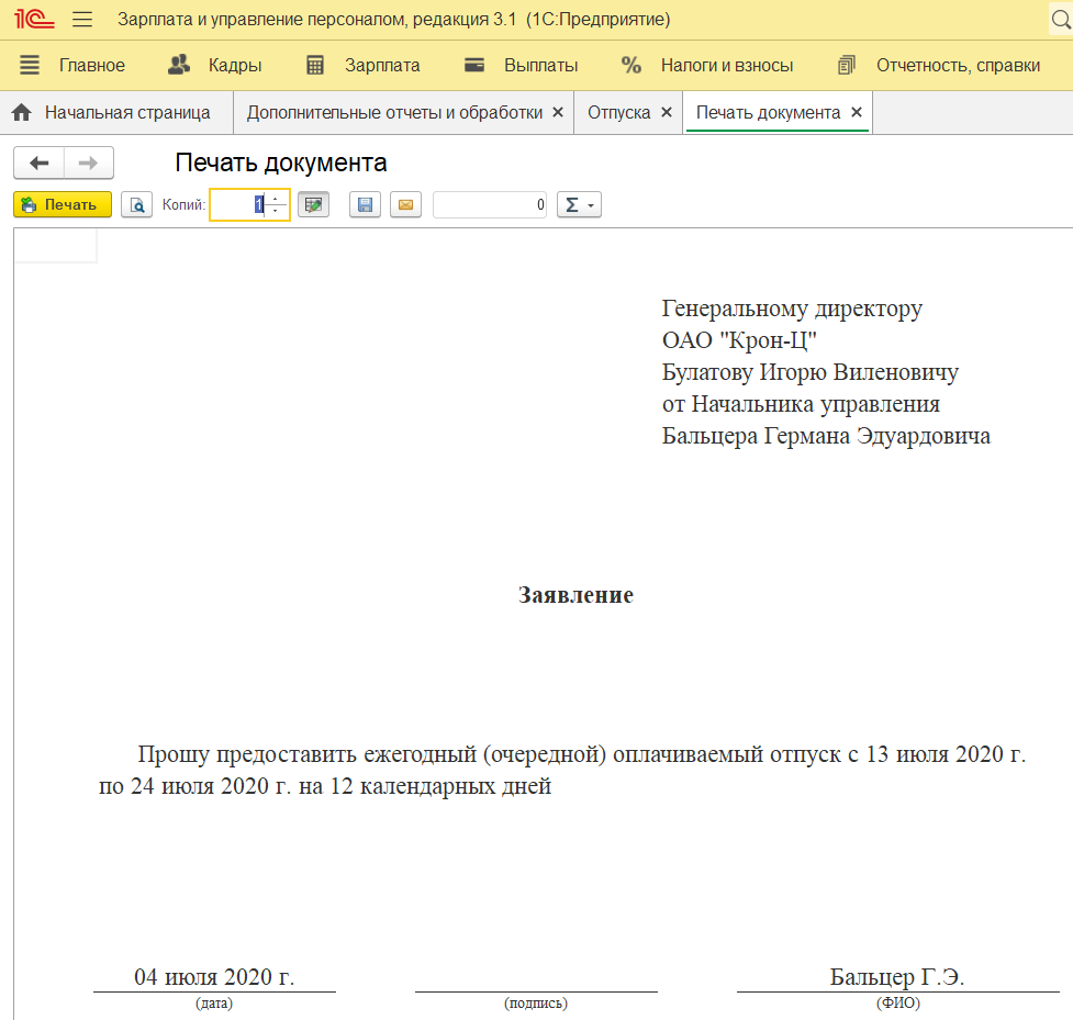 Заявление на отпуск сотрудника из справочника Сотрудники и документа Отпуск