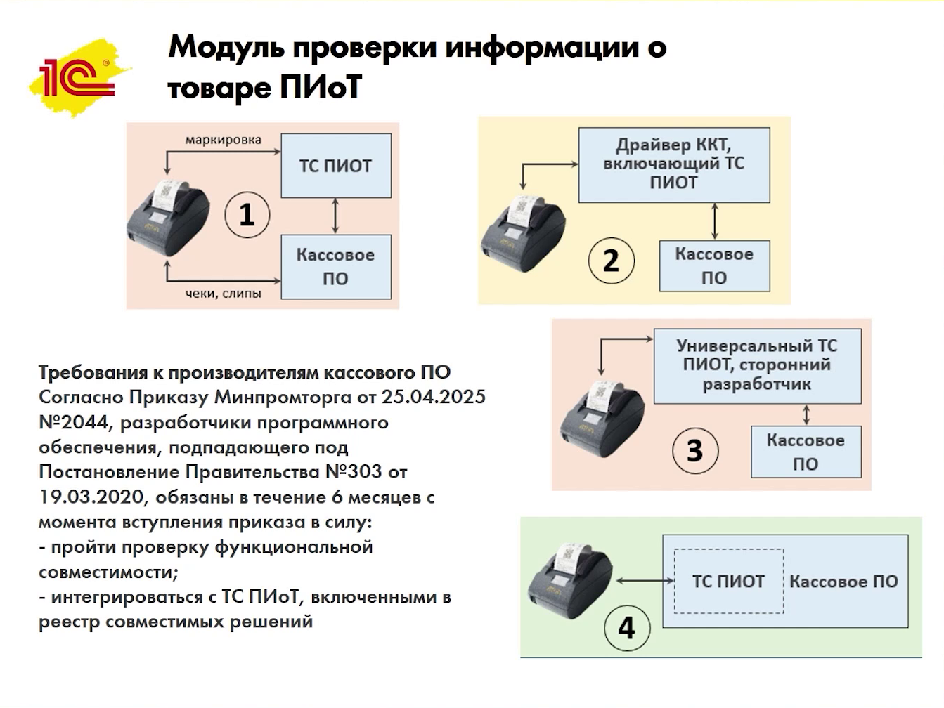 Требования к конкретной реализации функций ТС ПИоТ для продажи маркированного товара в розницу были сформулированы в поправках к постановлению №303, а приказ Минпромторга РФ от 25.04.2025 № 2044 зафиксировал сроки перехода на такой модуль и требования к сертификации кассового ПО.