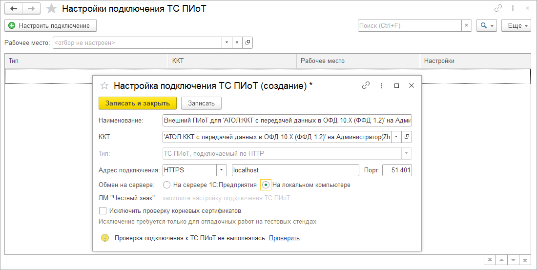 - Настроить связь ТС ПИоТ с фискальным регистратором и локальным модулем Честного знака.